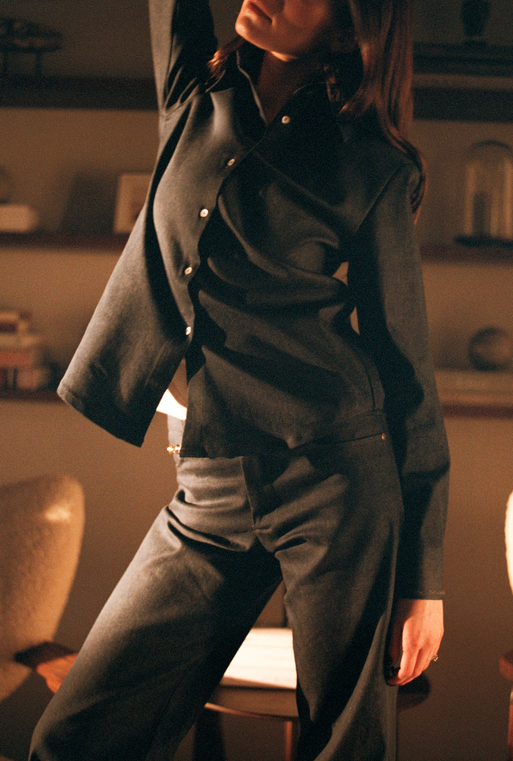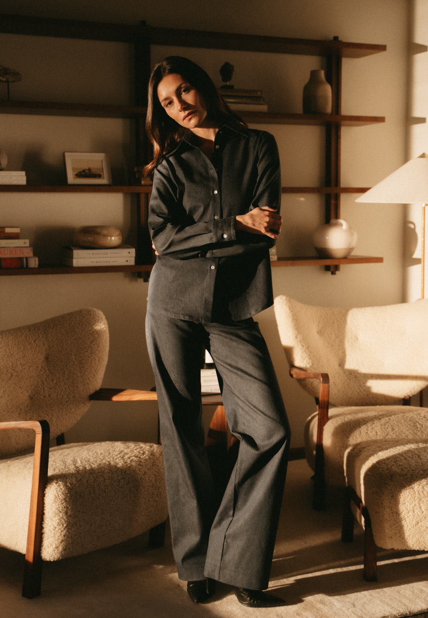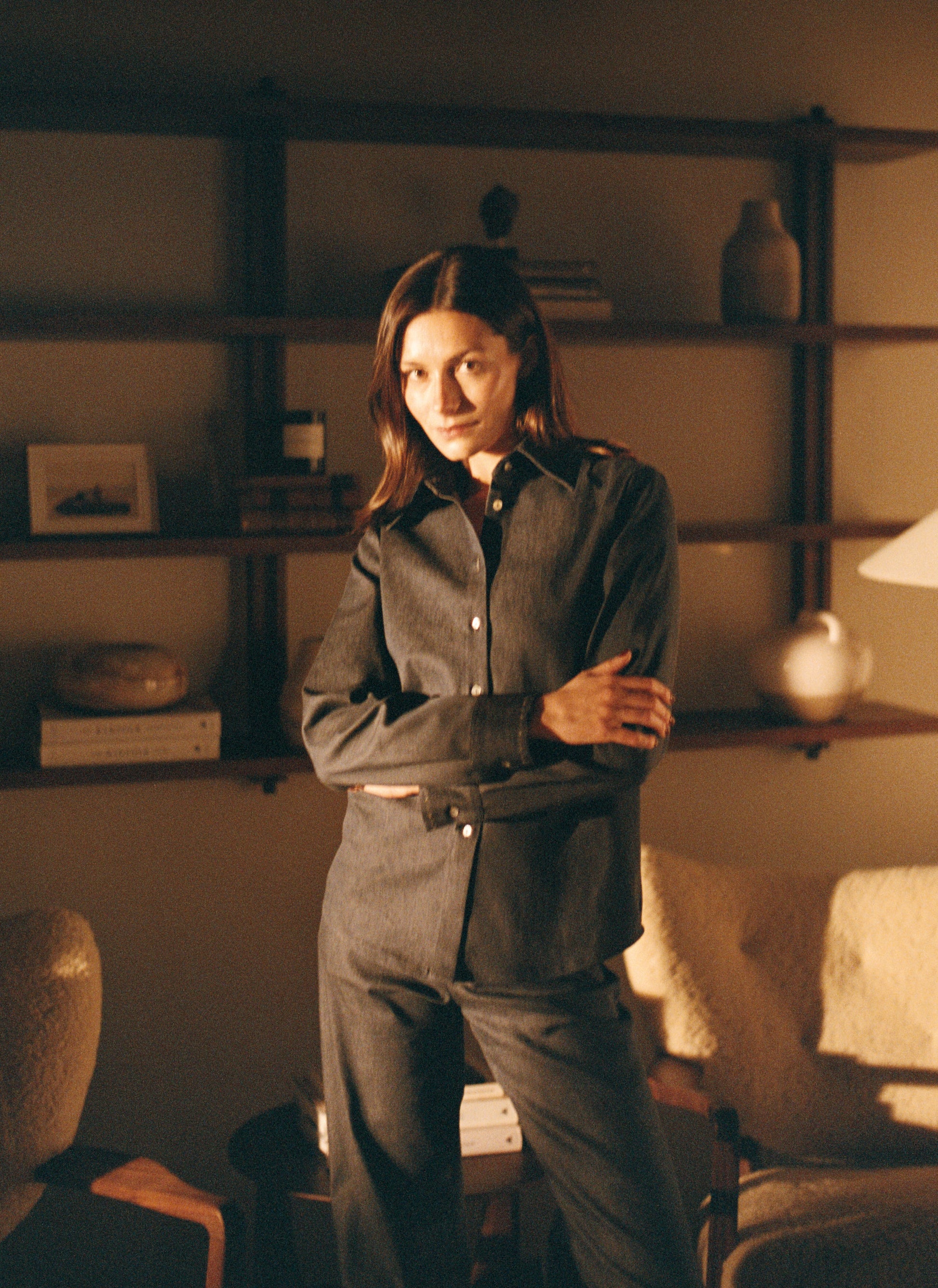 This shirt is made from denim stretch fabric from Nona Source, a company dedicated to sustainability through creative circularity. By repurposing luxury deadstock fabrics, Nona Source reduces waste and ensures high-quality materials are given new life, supporting eco-friendly fashion.